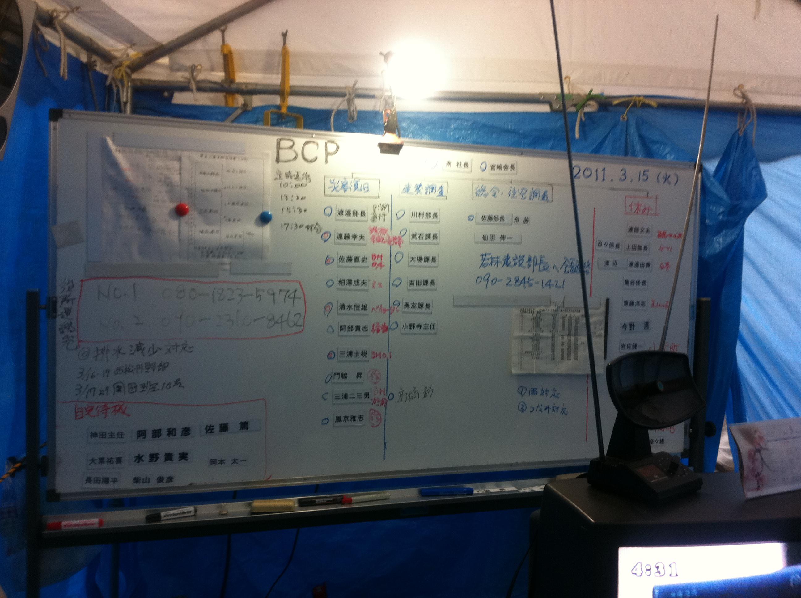 BCPの中では社長宅を代理事務所にすることや、少し離れた同社の住宅展示場に本社機能を移すなど、複数の代替拠点案を用意していたが、津波の避難勧告が出ていて、いずれの案も移動するのに危険が伴うと判断。震災から2時間後の16時42分には、屋外キャンプでの緊急事態対策本部が立ち上がった。